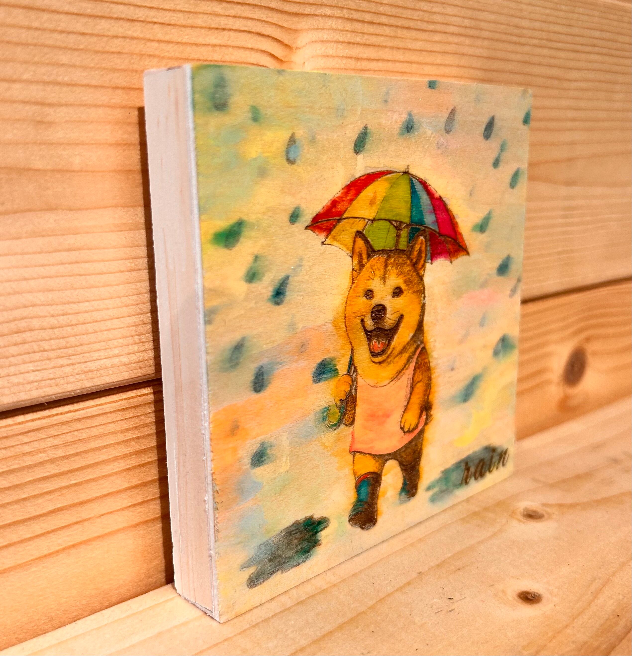 カラフルな傘をさして、元気いっぱいに歩く柴犬の姿を描いた、癒しのウッドアートボードです。雨の日も、この子の笑顔を見れば、自然と気分も晴れやかに。
